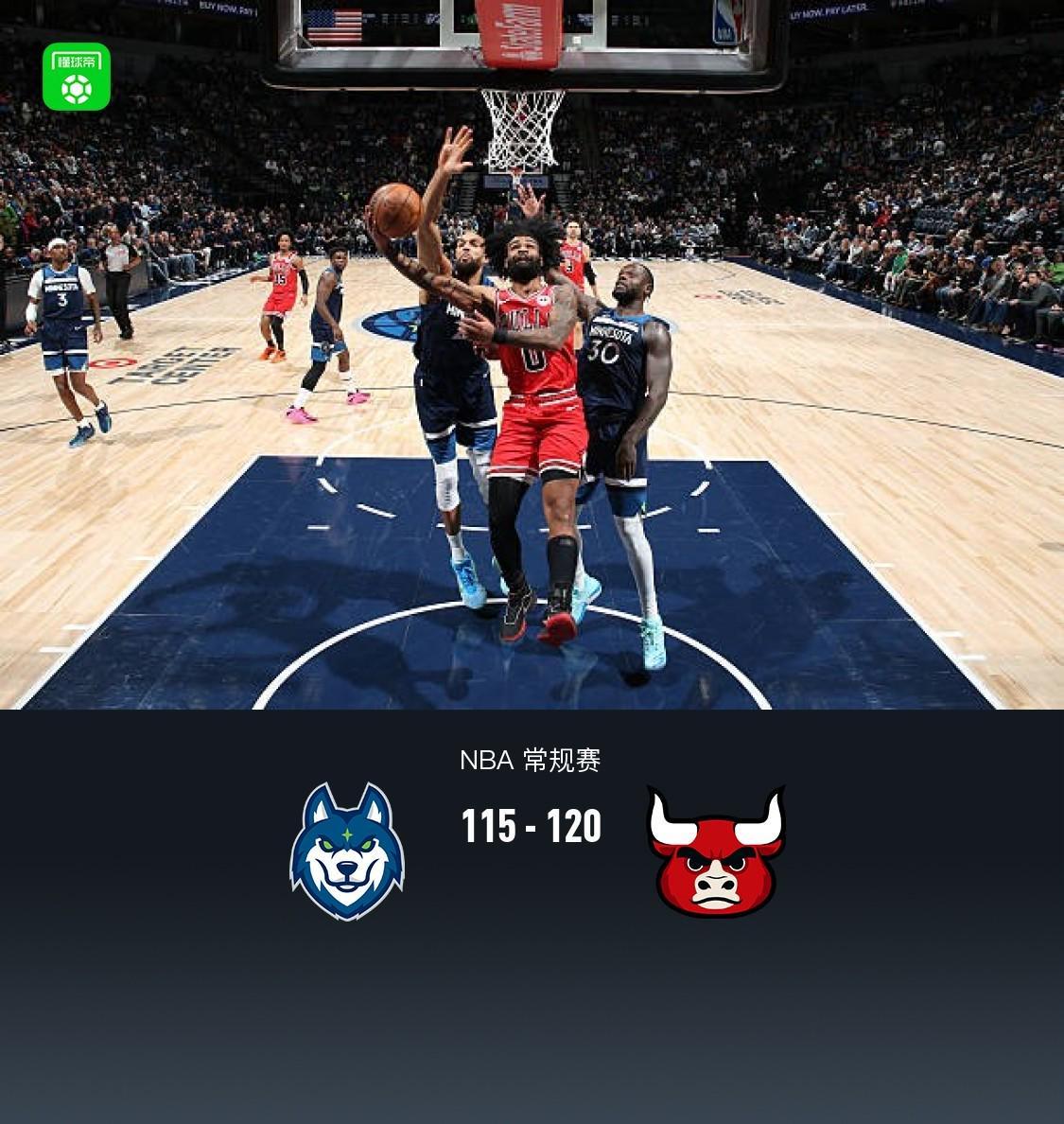第四节森林狼兰德尔拿下7分,公牛杰伦-史密斯拿下9分,最终森林狼115-120不敌公牛